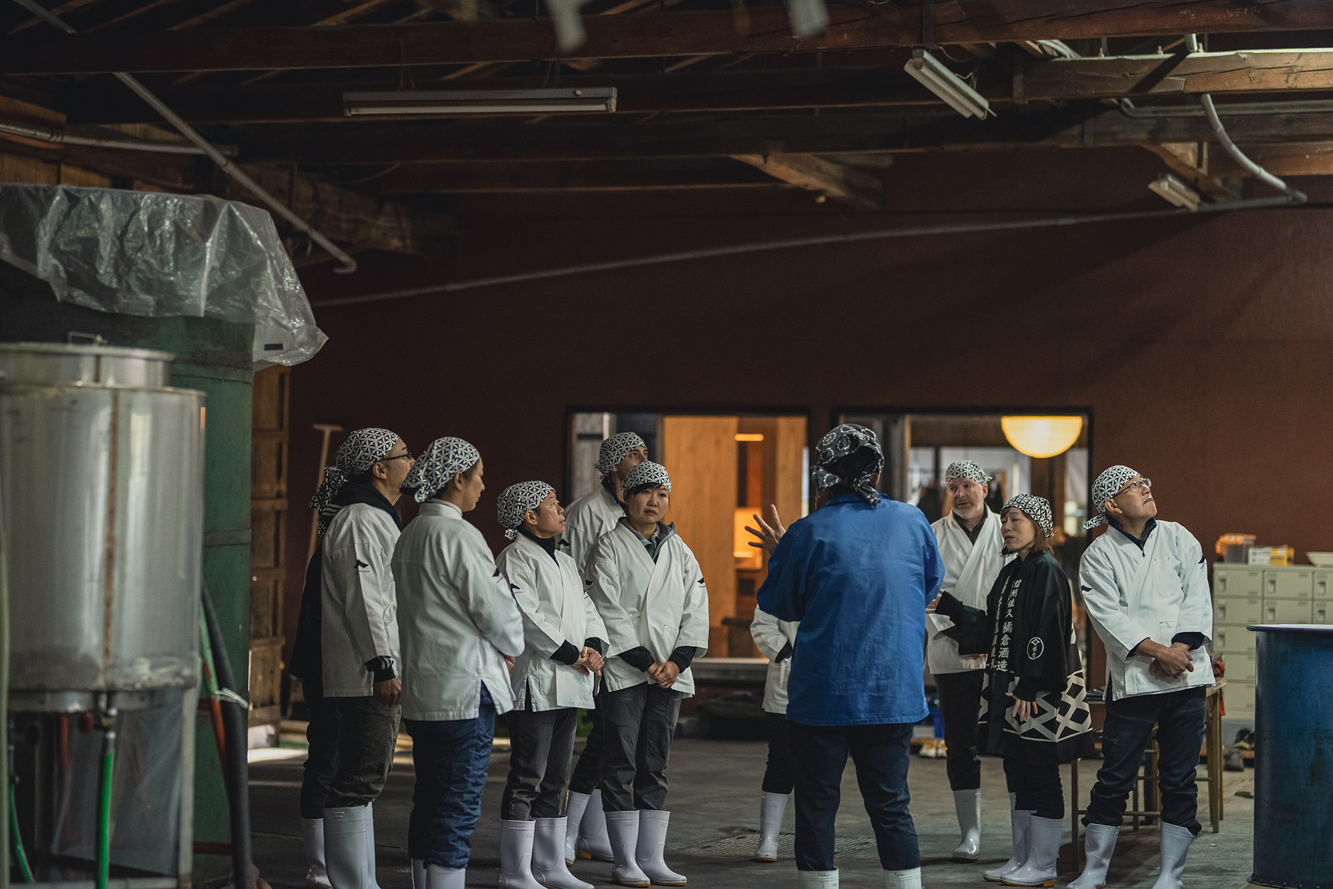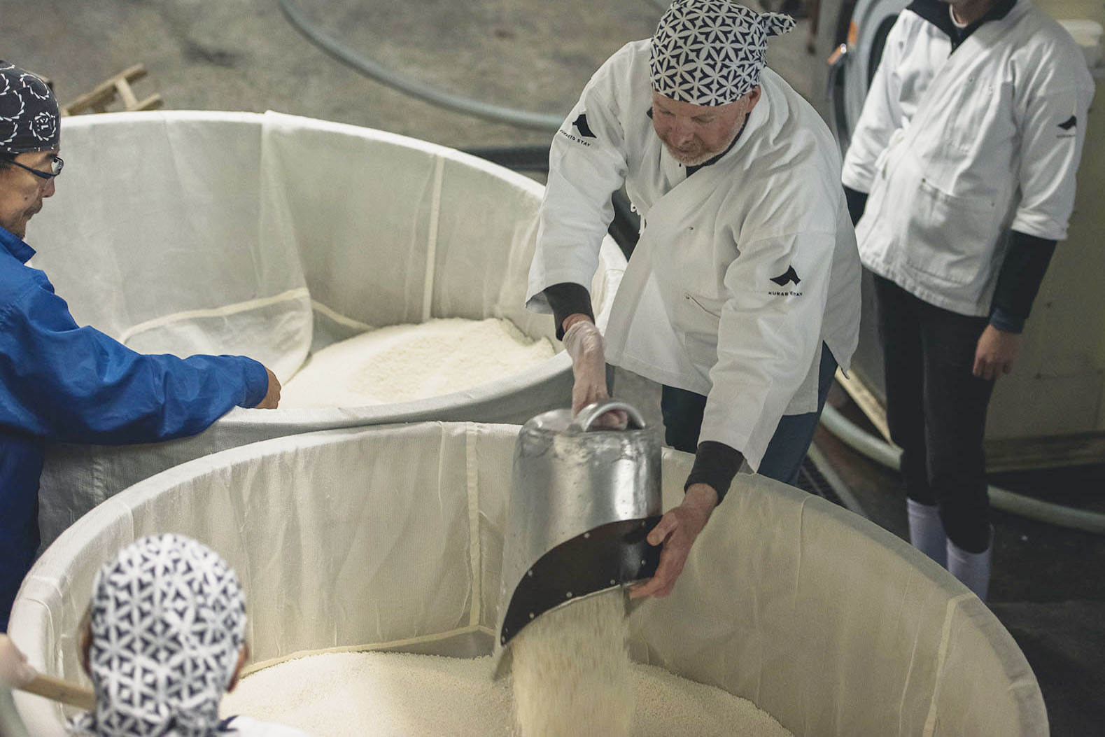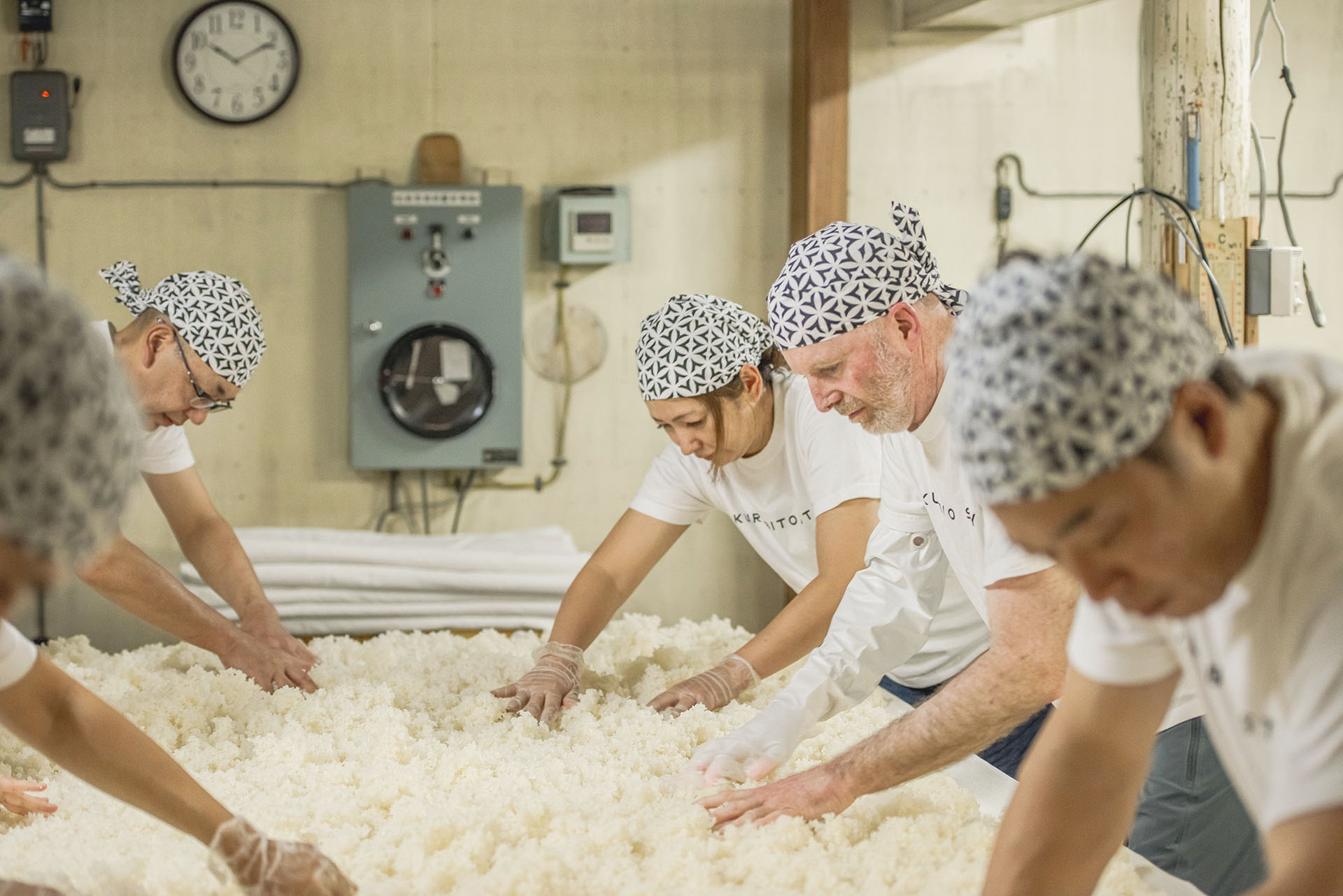 白衣、手ぬぐいなどのユニフォームを身にまとい、蔵元による作業についての説明を受けます。かつては職人だけしか入ることが許されなかった酒蔵。酒の神様である松尾様を祀る祭壇を前に、邪気祓いの儀式を行います。その後、いよいよ蔵人体験の始まりです。